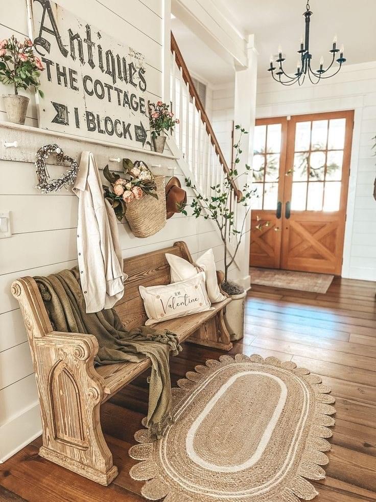 Ce sont souvent les petits détails qui donnent à une entrée de style farmhouse son charme unique. Ajoutez des accents de fer forgé, comme un luminaire chandelier ou des poignées de porte vintage, pour apporter une touche de rusticité à l’espace. Les textiles doux, comme des tapis en jute, des jetés moelleux ou des coussins en lin sur le banc en bois, ajoutent une touche de confort et de chaleur à l’entrée. Et n’oubliez pas les éléments décoratifs saisonniers, comme des couronnes de porte fleuries l’été ou des paniers de citrouilles à l’automne, pour ajouter une touche de charme rustique tout au long de l’année.