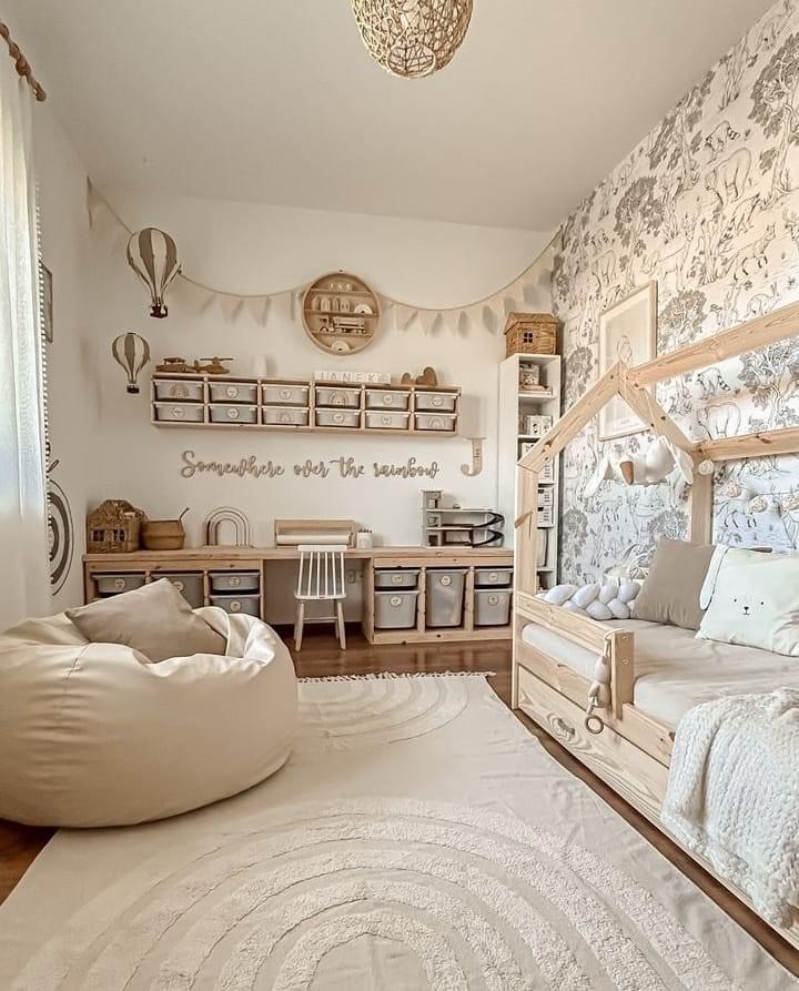 Les matériaux naturels comme le bois, le rotin, et le lin sont parfaits pour apporter une touche de nature dans la chambre. Optez pour des meubles en bois non traité ou peint dans des couleurs douces. Les paniers en osier peuvent servir à ranger les jouets tout en ajoutant une touche décorative. Les tapis en fibres naturelles, comme le jute ou le sisal, ajoutent également de la texture et de la chaleur à la pièce.