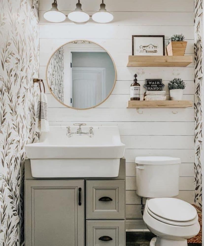 Pour éviter que la salle de bain ne paraisse trop sombre ou monotone, jouez avec des éléments de contraste. Associez le bois avec des matériaux comme le métal, la céramique ou le verre pour créer un équilibre visuel. Par exemple, des luminaires en métal blanc ou des accessoires de salle de bain en céramique blanche peuvent compléter parfaitement les accents de bois, ajoutant ainsi de la profondeur à votre décor. Un papier peint au motif délicat peut également ajouter une touche d’éclat qui attirera le regard.