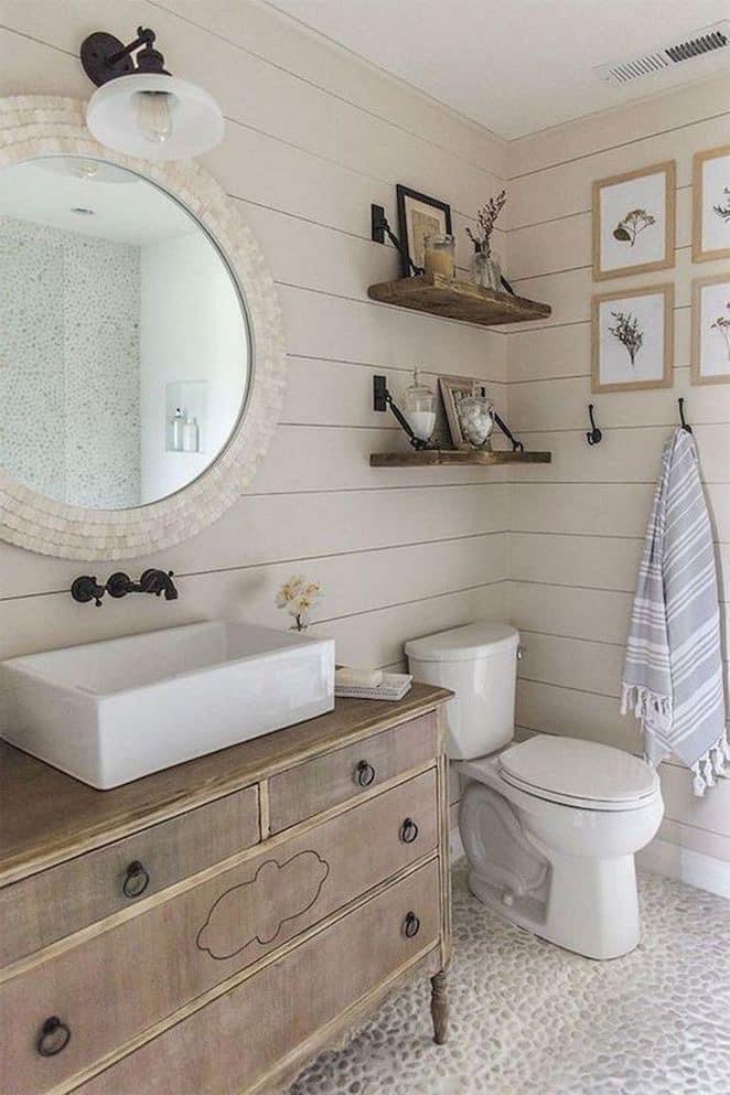 Le bois est un matériau polyvalent qui peut être utilisé de nombreuses façons pour ajouter une touche de nature à votre salle de bain. Optez pour des meubles en bois avec des finitions naturelles ou vieillies pour un look rustique et authentique. Une vanité en bois massif apportera une sensation de chaleur, tandis que des étagères en bois flottant créeront un espace de rangement élégant et fonctionnel.
