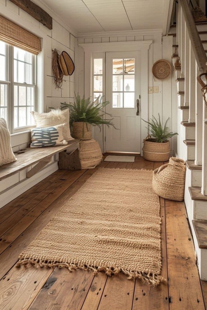 Les tapis en fibres naturelles comme le jute, le sisal ou le chanvre sont parfaits pour ajouter un élément de nature sous vos pieds. Leur texture rugueuse et leurs teintes neutres se marient bien avec une décoration inspirée de la nature. Placez-les dans les pièces principales pour créer un espace chaleureux et accueillant tout en introduisant des matériaux durables et respectueux de l’environnement.